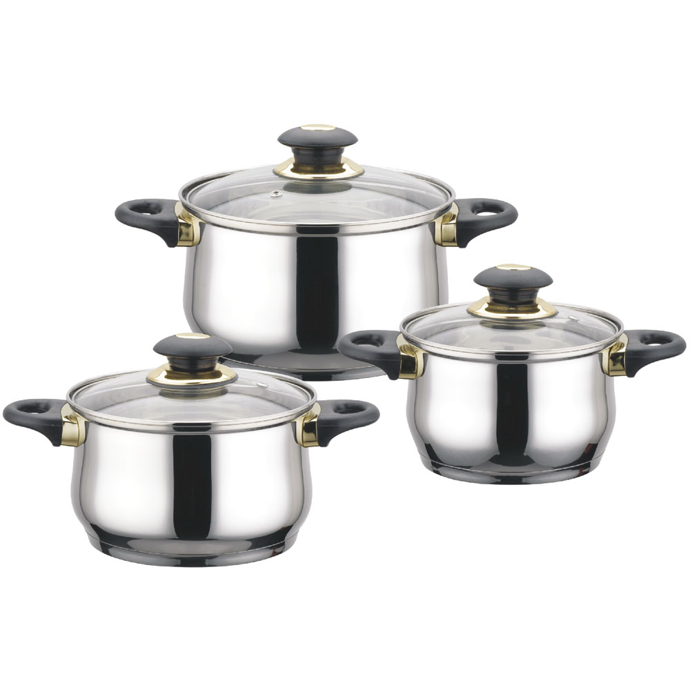 Набор кастрюль Jumbo из 6 предметов Кастрюли 16 см (1,8 л)/ 18 см (2,1 л)/ 20 см (3 л) Высококачественная нержавеющая сталь Поверхность зеркальная Крышки стеклянные Ручки бакелитовые Дно капсулированное