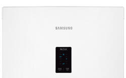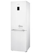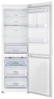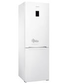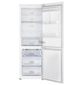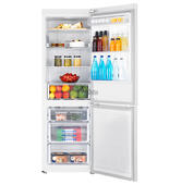 Вместительный белый двухкамерный холодильник Samsung RB-33J3200WW с инверторным двигателем и морозильником, расположенным в нижней части.
