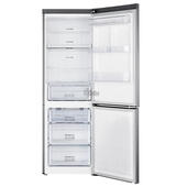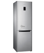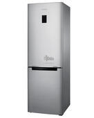 Серебристый стильный двухкамерный холодильник Samsung RB-33J3200SA с инверторным двигателем и морозильником, расположенным в нижней части.