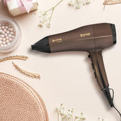 Решетка фена имеет инновационное покрытие Tourmaline Ionic, образующее при нагревании отрицательные ионы, которые запечатывают чешуйки волос и снимают статическое электричество. В комплект входят две насадки: концентратор и диффузор. Первый способствует усилению воздушного потока и воздействию на определенные пряди, что помогает создавать задуманную вами прическу.