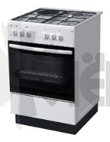 60*60*85, 1 чугунная конфорка и 3 газовые горелки, электророзжиг, духовка электро объемом 64л., конвекция, гриль, ящик д/посуды, зад. щиток, 2 противня и решетка в комплекте