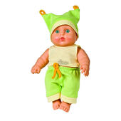 В комплект одежды входит: трикотажная безрукавая футболка, штанишки и шапочка. Игровые возможности куклы: благодаря небольшому размеру и продуманной конструкции эту куклу легко и удобно брать на ручки , сажать, укладывать спать, переодевать.