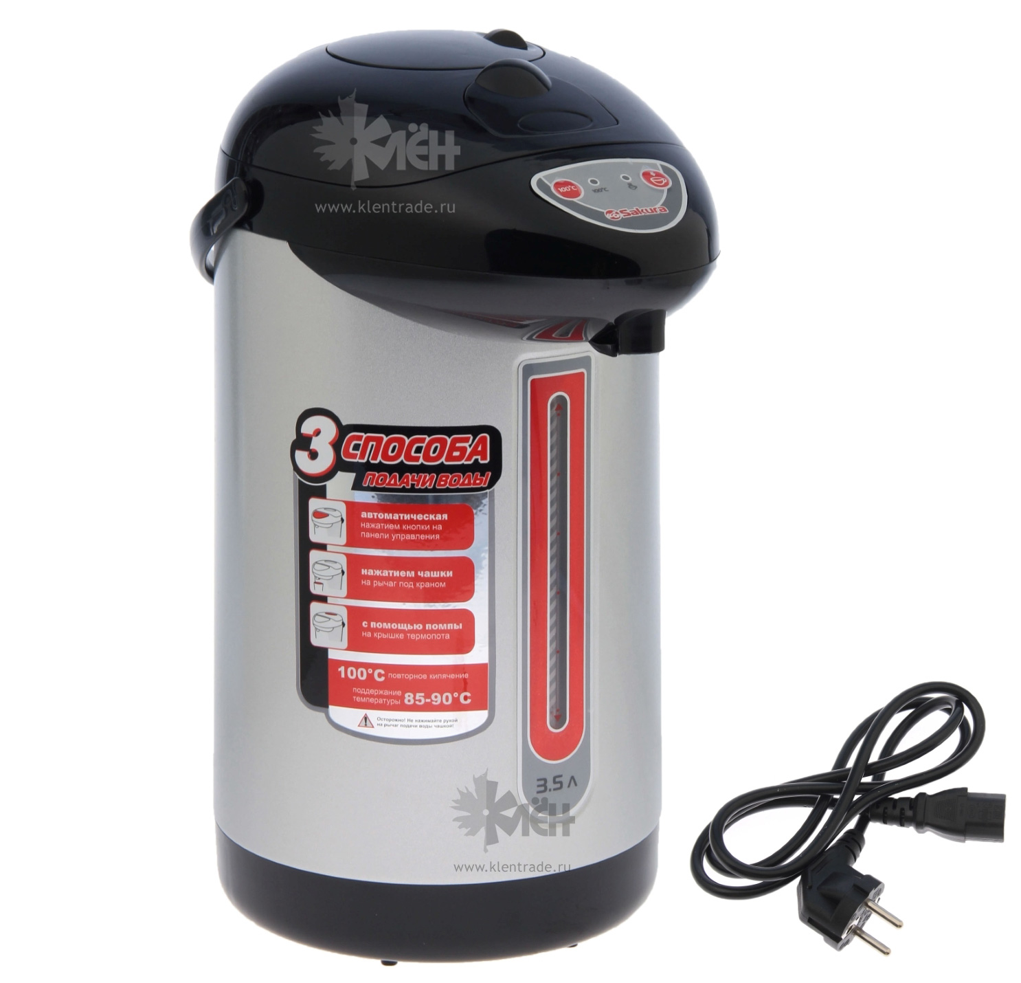 Термопот SAKURA SA-353B это кухонный прибор успешно сочетающий в себе функции чайника, термоса и кулера. Как и чайник, он нагревает воду, как термос, может поддерживать её температуру на заданном пользователем уровне. Конструкция термоса включает в себя полностью стальной корпус. Нержавеющая сталь корпуса не подвержена коррозии и сохраняет природный вкус чистой воды.