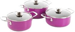 Объем: 3 кастрюли 2,8л(20см) 3,6л(22см) 5л(24см), крышки стекл., ручки метал., антиприг. керам. покрытие, корпус цветной.