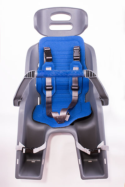 крепление на или вместо багажника, трехточечный ремень безопасности, мягкая обивка сиденья, подголовник, регулируемые упоры для ног с ремнями, максимально допустимая нагрузка: 25 кг,