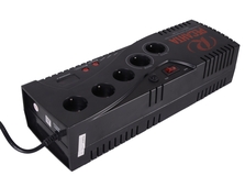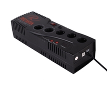 Данный стабилизатор оборудован 5 розетками, 2 из которых имеют функцию байпас. Кроме того, есть возможность увеличения задержки включения стабилизатора при коротком отключении электроэнергии, что позволяет защитить высокочувствительную технику. Также прибор имеет дисплей с возможностью отображения входного и выходного напряжения. Номинальная мощность при входящем напряжении 190В составляет 1500Вт.