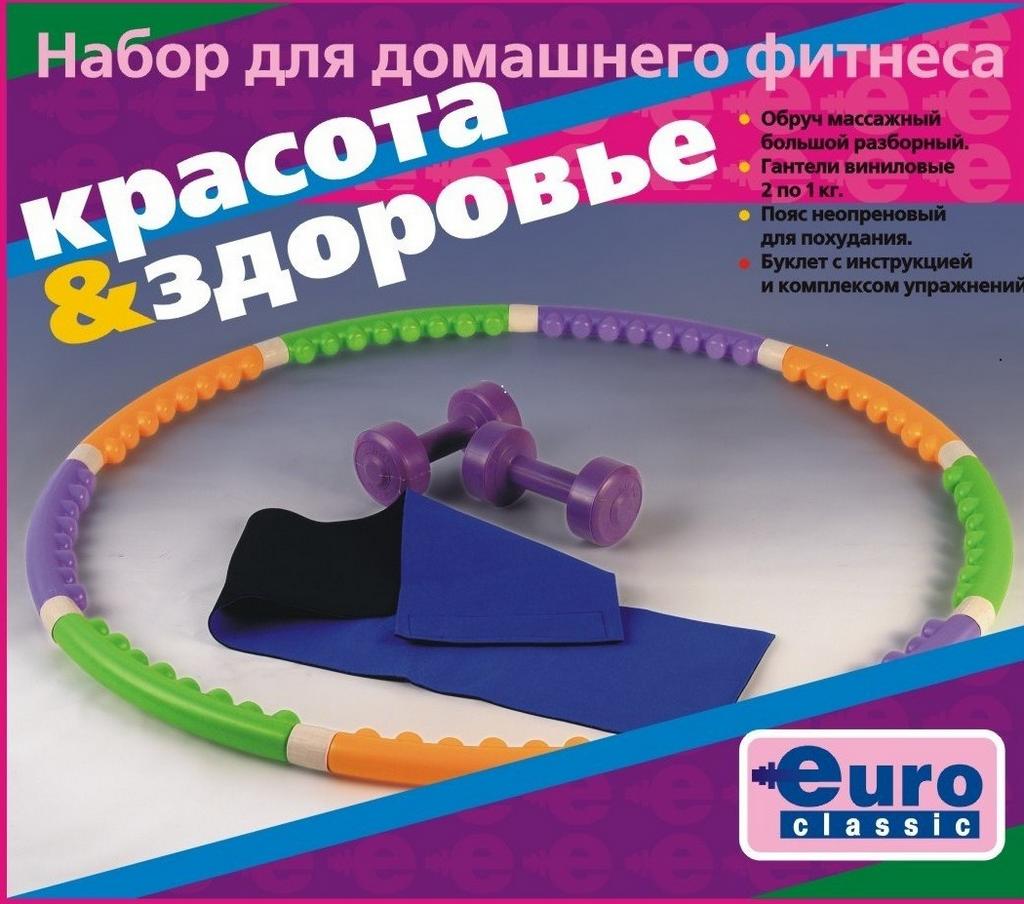 Набор для фитнеса Красота и здоровье Предназначен для занятий в домашних условиях. Способствует развитию организма, избавления от лишнего веса, формированию идеальной фигуры. Набор рекомендован молодым мамам, которые решили заняться собой (только родившим необходима консультация ведущего врача). Индивидуальная упаковка, Буклет с упражнениями. Комплектация: - обручь Euro Hoop разборный, массажный, с замками. - виниловые гантели 1 кг. - 2 шт. - неопреновый пояс для похудения - брошюра с вариантами и комплексами упражнений