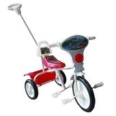 Металлические колеса, яркая передняя панель, сзади кузовок-корзинка для игрушек, удобная широкая спинка, управляющая родительская ручка, подножка