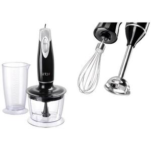 Мощность: 300 Вт, Съемная ножка погружного блендера из нерж стали, Венчик для взбивания из нерж стали, Чаша измельчителя из пластика, Объем измельчителя 500 мл, Мерный стакан, 700 мл,