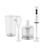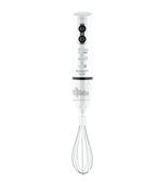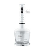 Корпус и погружная часть устройства изготовлены из пластика, безопасного для использования с продуктами питания. Набор укомплектован мини-измельчителем, венчиком и мерным стаканом, в котором очень удобно измельчать необходимые для блюда ингредиенты в точном соответствии с рецептом.