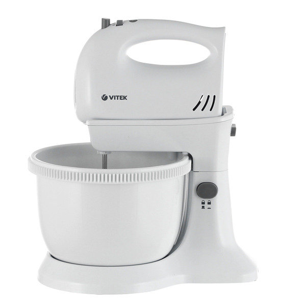 300Вт, 5 скоростей, турборежим, чаша 3300мл, вращение чаши, венчики для взбивания, крюки для замеса теста