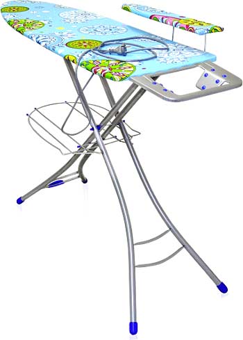 Фанера, 1220*380 мм, плавно регул. высота до 90 см, европодставка под утюг с термосиликоном, электроудлинитель 2,2 м, электророзетка, съемный подрукавник, полка для белья, чехол бязь.