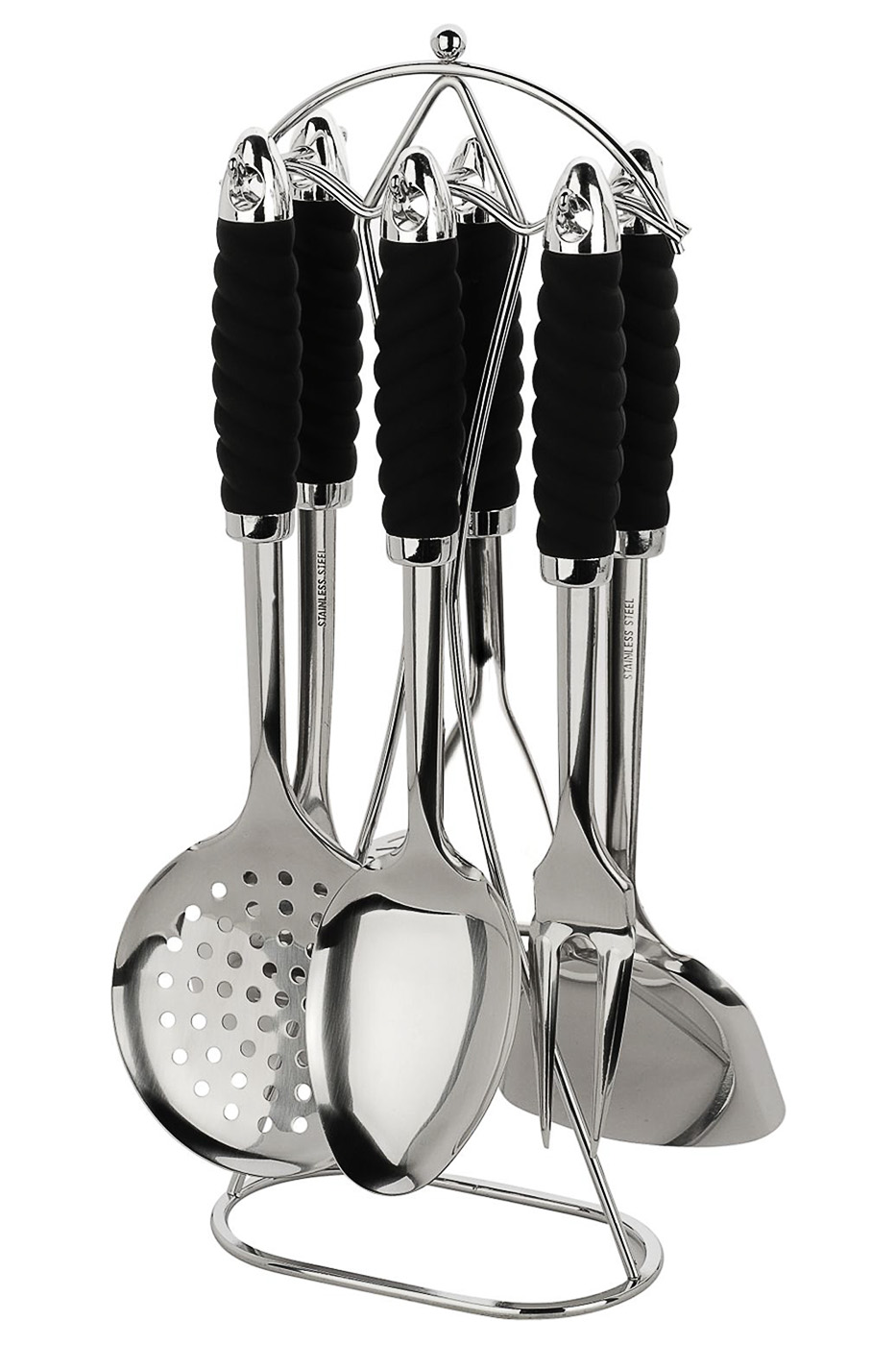 Цвет черный, серебристый Состав нержавеющая сталь, пластик Описание можно мыть в посудомоечной машине Размеры половник 32 см, картофелемялка 32 см, шумовка 32 см, венчик 32 см, ложка 32см, вилка для мяса 32см Уход за изделием можно мыть в посудомоечной машине