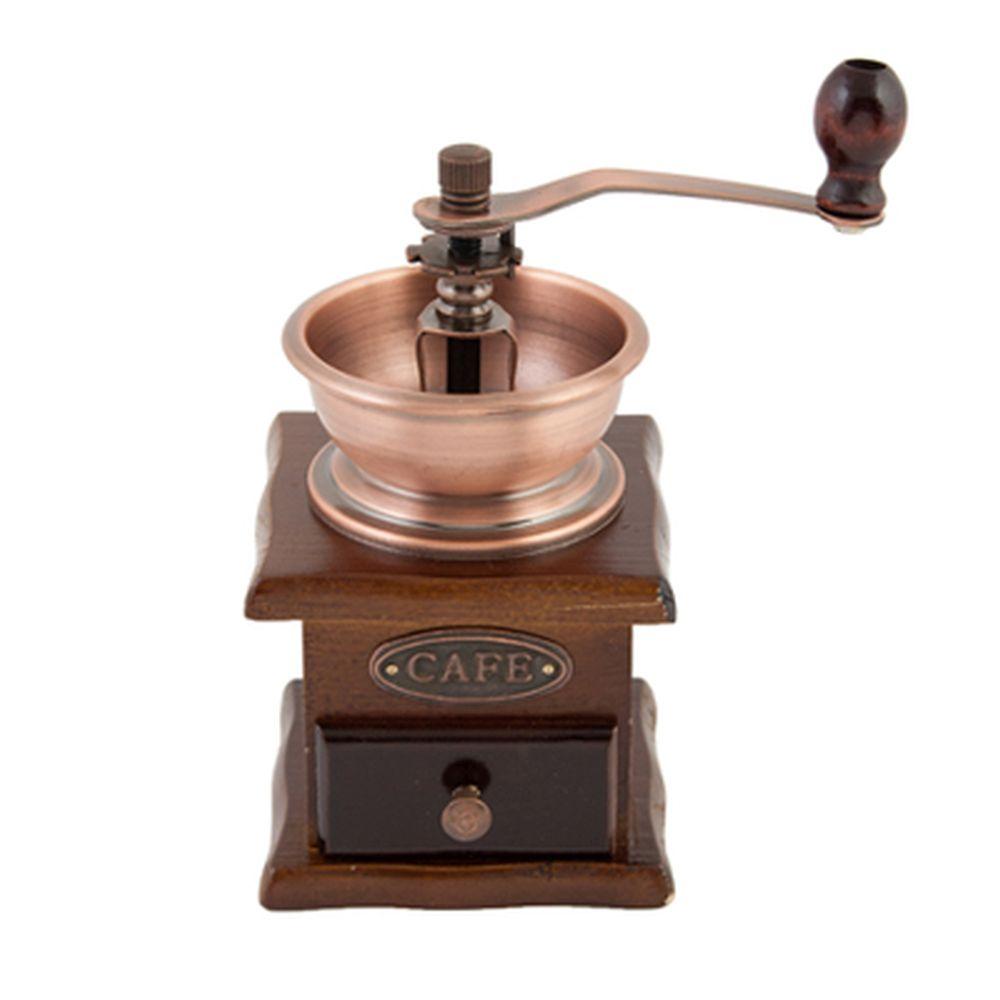 Дерево, воронка медного цвета, керамический механизм, регулировка помола, вращение руки по или против часовой стрелки