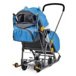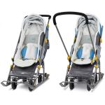 Плоские полозья 40 мм, пятиточечный ремень, складной козырек с декор. ушками, спинка рег-тся до положения лежа, подножка с регул. наклоном ног, бол. колесо, смотровое окошко,сумка, муфта для рук