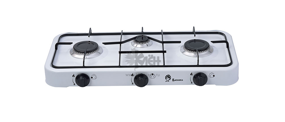 Компактная настольная газовая плитка Василиса ГП3-1510А оснащена тремя газовыми конфорками для разогрева и приготовления различных блюд. Плита предназначена для использования на даче и совместима исключительно с баллонным сжиженным газом.