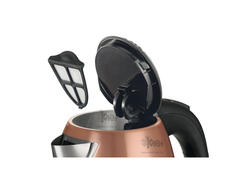 Прибор оснащен съемным моющимся фильтром от накипи, что позволяет существенно продлить срок его использования. Корпус выполнен в медной расцветке. Изысканное решение успешно дополнит интерьер любой кухни или офиса.