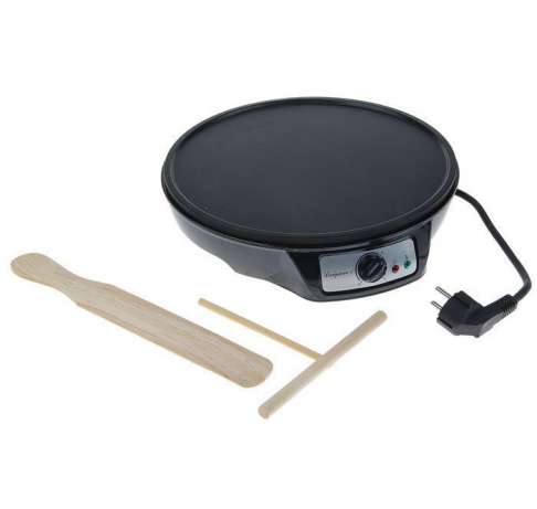 1000 Вт, фиксированная панель на 1 блин размером 30 см, антипригарное покрытие, регулировка температуры, термостойкий корпус В комплекте также: лопатка для блинов, шпатель для теста