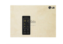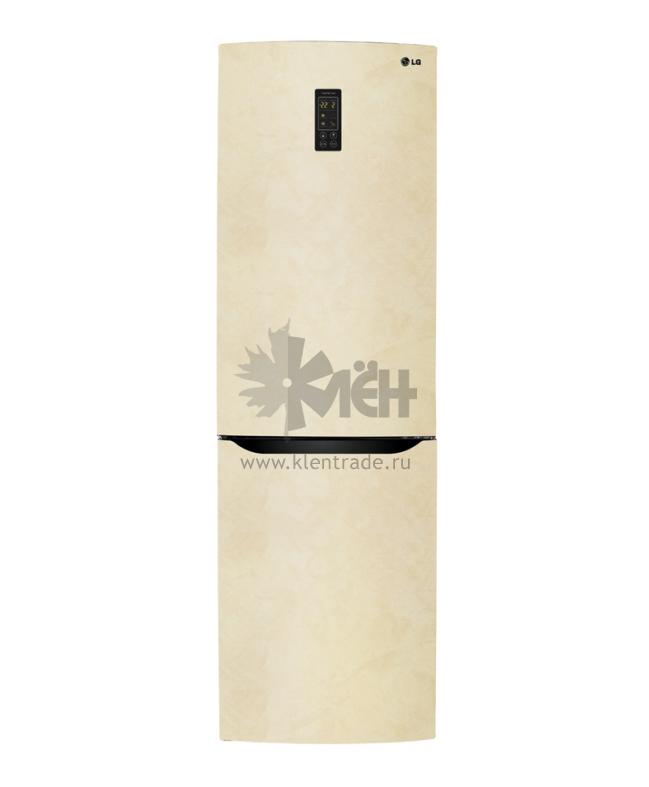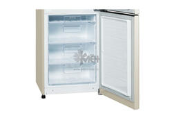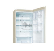 Бежевый двухкамерный холодильник LG GA-B419 SEQL с умным инверторным мотором и морозильником, расположенным в нижней части.