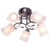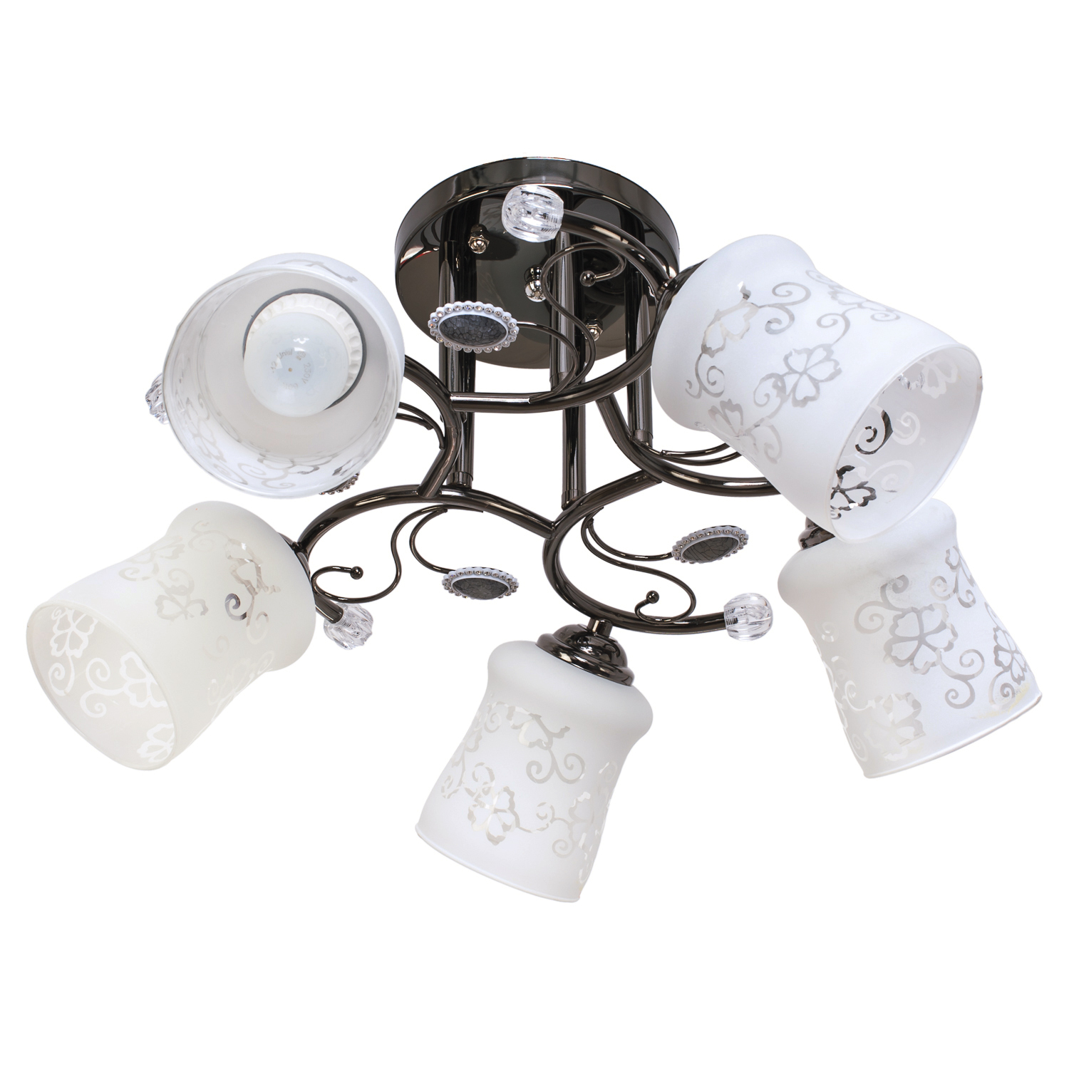 Количество ламп: 5 шт. Цоколь: E27 Макс. мощность одной лампы: 60 W Лампы в комплекте: Нет Светодиодная подсветка: Нет Материал и цвет Цвет каркаса: Черный Цвет плафона: Белый Материал каркаса: Металл Материал плафона: Стекло Размеры светильника Длина (ось Z): 60 см Ширина (ось X): 60 см Высота (ось Y): 26 см