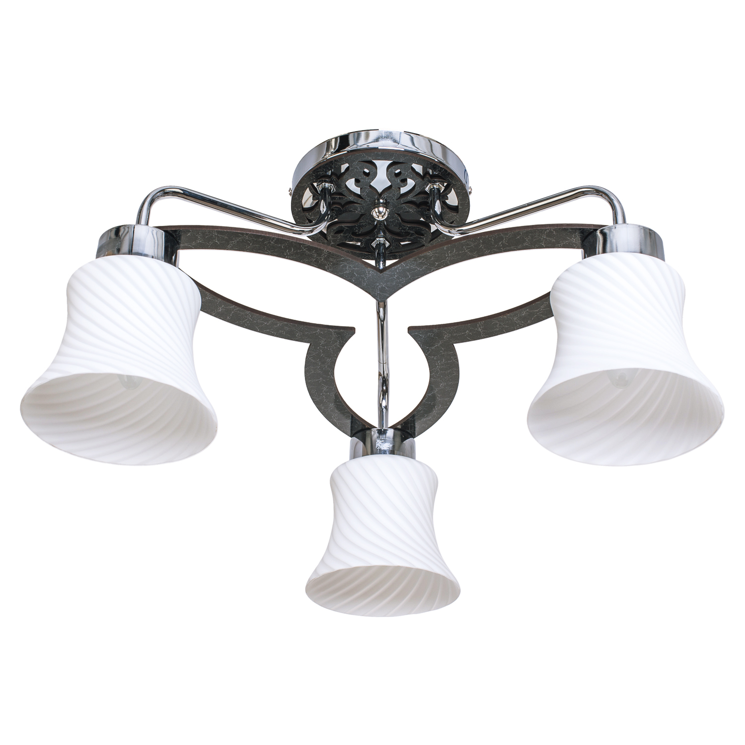 Количество ламп: 3 шт. Цоколь: E27 Макс. мощность одной лампы: 60 W Лампы в комплекте: Нет Светодиодная подсветка: Нет Материал и цвет Цвет каркаса: Хром Цвет плафона: Белый Материал каркаса: Металл Материал плафона: Стекло Размеры светильника Длина (ось Z): 55 см Ширина (ось X): 55 см Высота (ось Y): 32 см