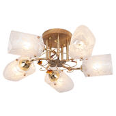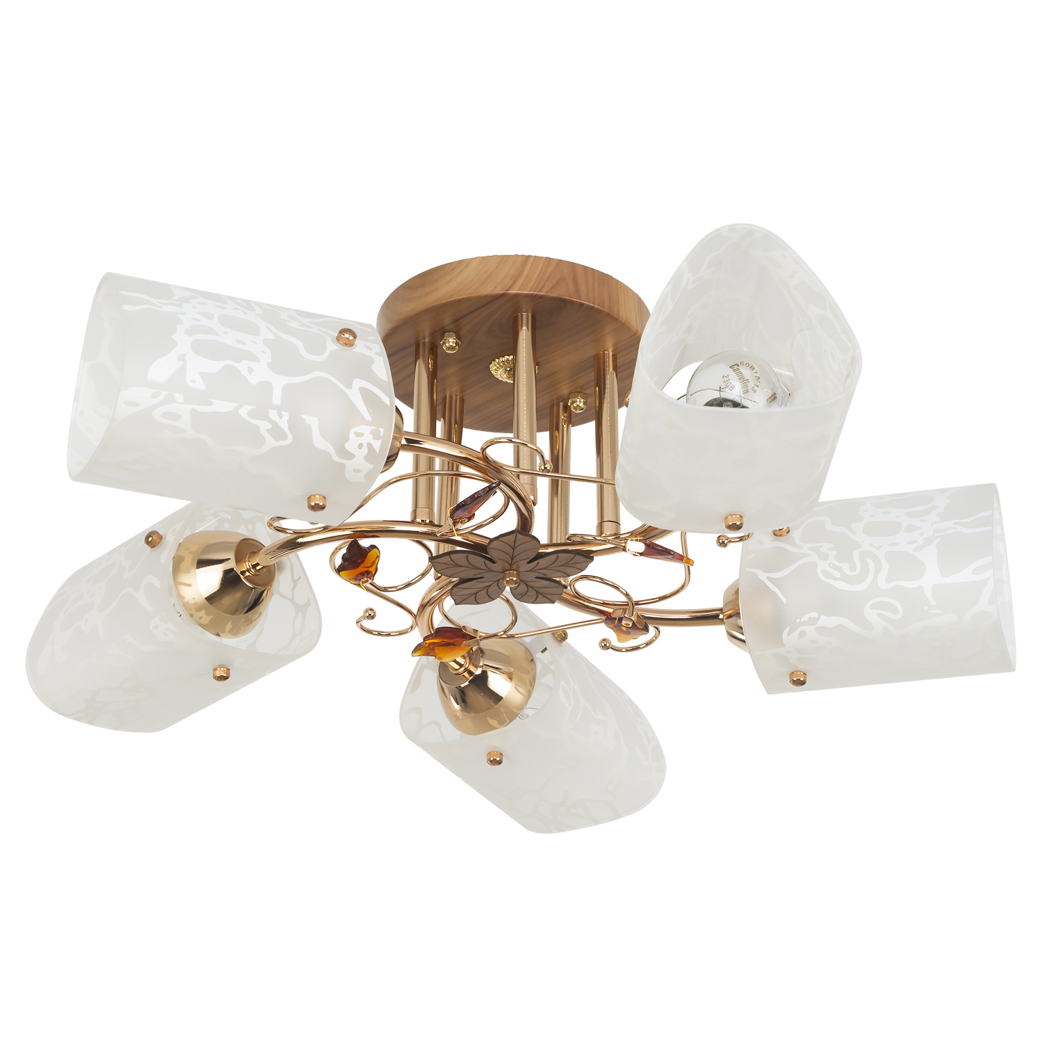 Количество ламп: 5 шт. Цоколь: E27 Макс. мощность одной лампы: 60 W Светодиодная подсветка: Нет Материал и цвет Цвет каркаса: Золотой / Коричневый Цвет плафона: Белый Материал каркаса: Дерево / Металл Материал плафона: Стекло Размеры светильника Длина (ось Z): 59 см Ширина (ось X): 50 см Высота (ось Y): 27 см