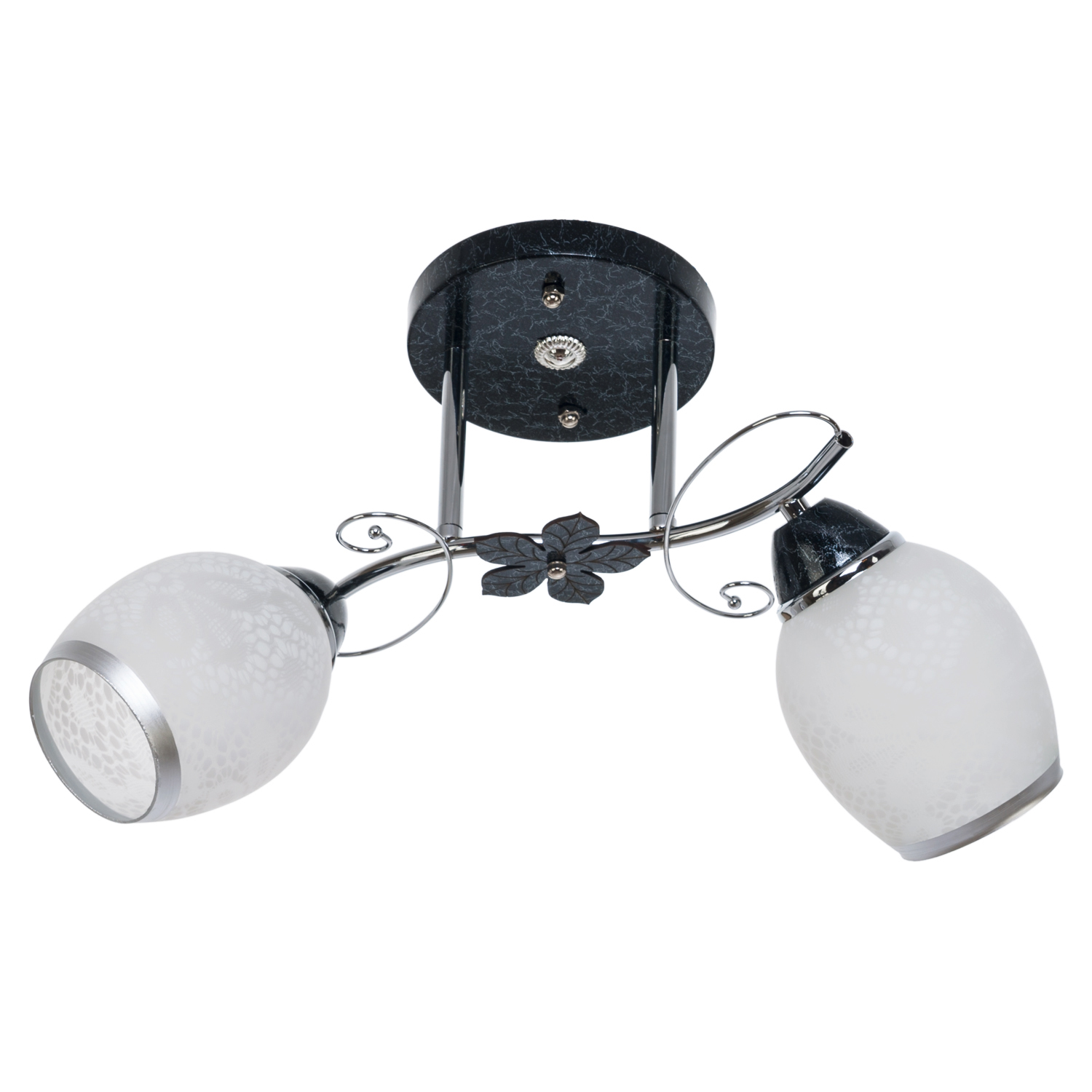 Количество ламп: 2 шт. Цоколь: E27 Макс. мощность одной лампы: 40 W Светодиодная подсветка: Нет Материал и цвет Цвет каркаса: Хром / Черный Цвет плафона: Белый Материал каркаса: Металл Материал плафона: Стекло Размеры светильника Длина (ось Z): 47 см Ширина (ось X): 27 см Высота (ось Y): 28 см