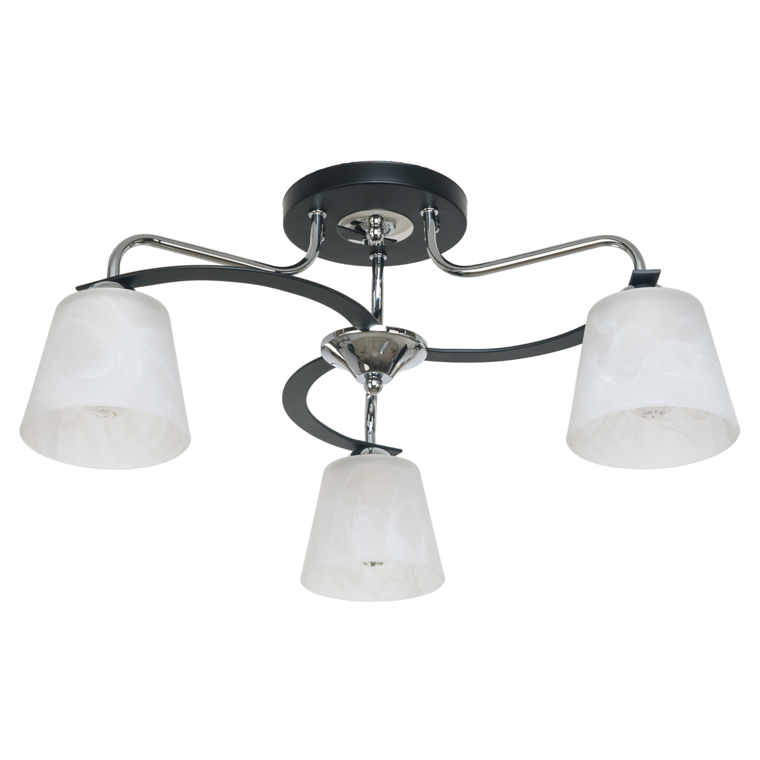 Количество ламп: 3 шт. Цоколь: E27 Макс. мощность одной лампы: 60 W Светодиодная подсветка: Нет Материал и цвет Цвет каркаса: Хром / Черный Цвет плафона: Белый Материал каркаса: Металл Материал плафона: Стекло Размеры светильника Длина (ось Z): 56 см Ширина (ось X): 56 см Высота (ось Y): 25 см