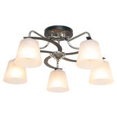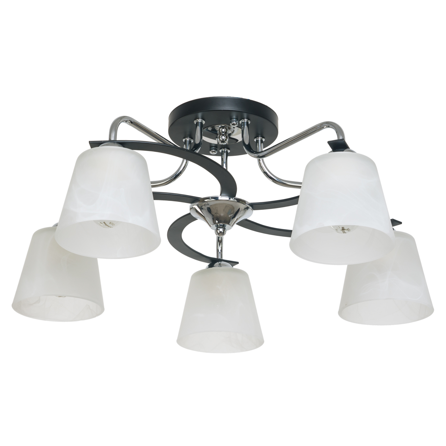 Количество ламп: 5 шт. Цоколь: E27 Макс. мощность одной лампы: 60 W Светодиодная подсветка: Нет Материал и цвет Цвет каркаса: Хром / Черный Цвет плафона: Белый Материал каркаса: Металл Материал плафона: Стекло Размеры светильника Длина (ось Z): 56 см Ширина (ось X): 56 см Высота (ось Y): 25 см