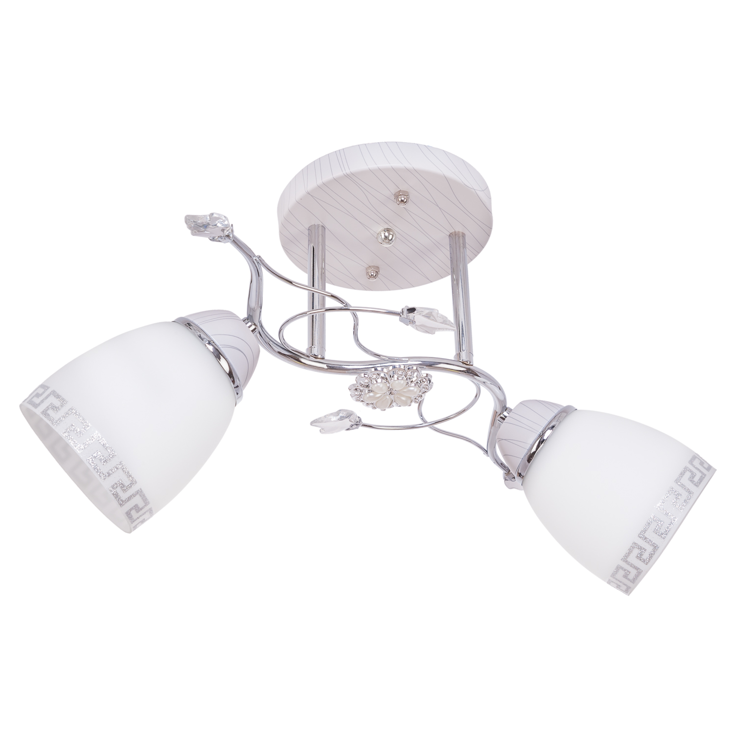 Количество ламп: 2 шт. Цоколь: E27 Макс. мощность одной лампы: 60 W Лампы в комплекте: Нет Светодиодная подсветка: Нет Материал и цвет Цвет каркаса: Белый / Хром Цвет плафона: Белый Материал каркаса: Металл Материал плафона: Стекло Размеры светильника Длина (ось Z): 45 см Ширина (ось X): 32 см Высота (ось Y): 28 см