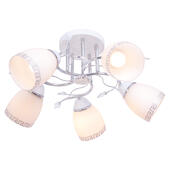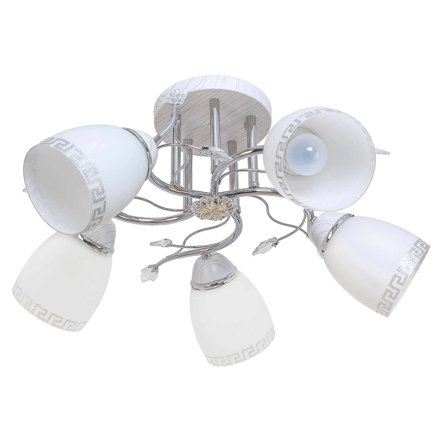 Количество ламп: 5 шт. Цоколь: E27 Макс. мощность одной лампы: 60 W Лампы в комплекте: Нет Светодиодная подсветка: Нет Материал и цвет Цвет каркаса: Белый / Хром Цвет плафона: Белый Материал каркаса: Металл Материал плафона: Стекло Размеры светильника Длина (ось Z): 60 см Ширина (ось X): 60 см Высота (ось Y): 28 см