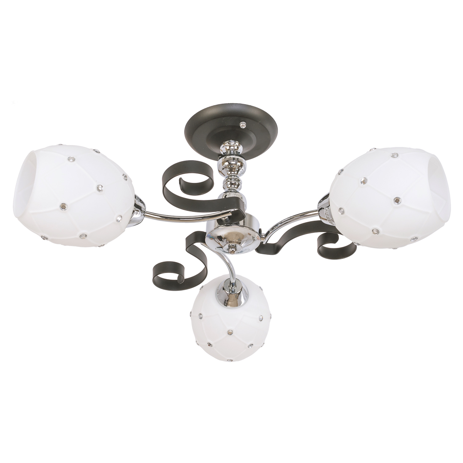 Количество ламп: 3 шт. Цоколь: E27 Макс. мощность одной лампы: 60 W Лампы в комплекте: Нет Светодиодная подсветка: Нет Материал и цвет Цвет каркаса: Хром / Черный Цвет плафона: Белый Материал каркаса: Металл Материал плафона: Стекло Размеры светильника Длина (ось Z): 65 см Ширина (ось X): 65 см Высота (ось Y): 25 см