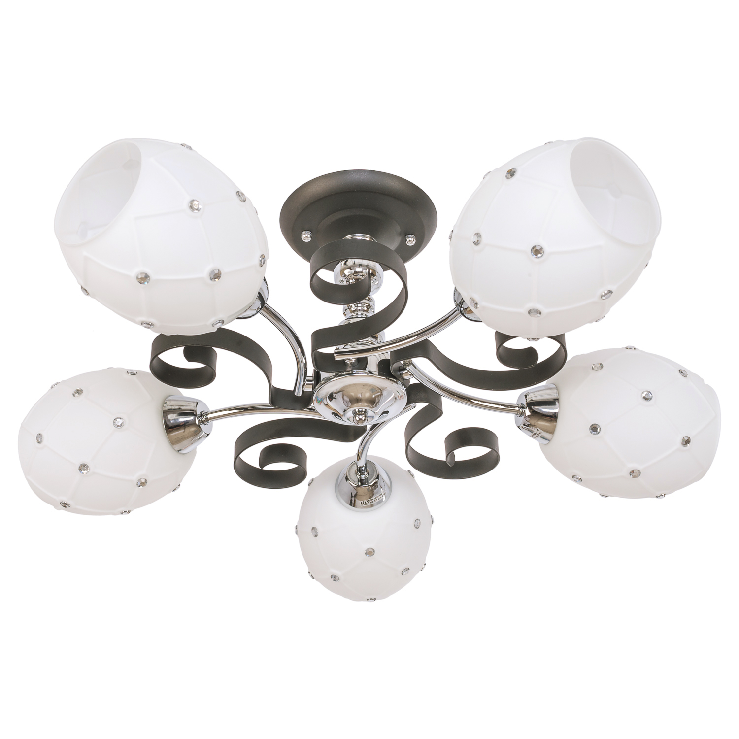 Количество ламп: 5 шт. Цоколь: E27 Макс. мощность одной лампы: 60 W Лампы в комплекте: Нет Светодиодная подсветка: Нет Материал и цвет Цвет каркаса: Хром / Черный Цвет плафона: Белый Материал каркаса: Металл Материал плафона: Стекло Размеры светильника Длина (ось Z): 70 см Ширина (ось X): 70 см Высота (ось Y): 25 см
