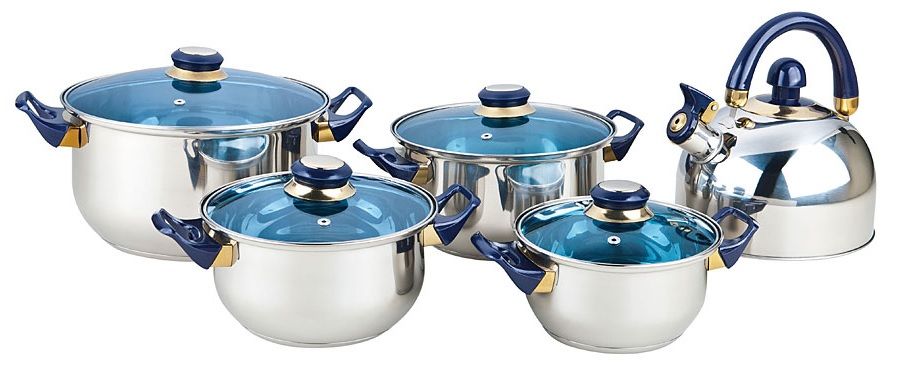 9 предметов: 4 кастрюли со стекл.крышками : 16см/1,6л, 18см/2,4л, 20см/2,8л, 24см/5,6л и чайник 2л. метал.со свистком и подвижной ручкой.