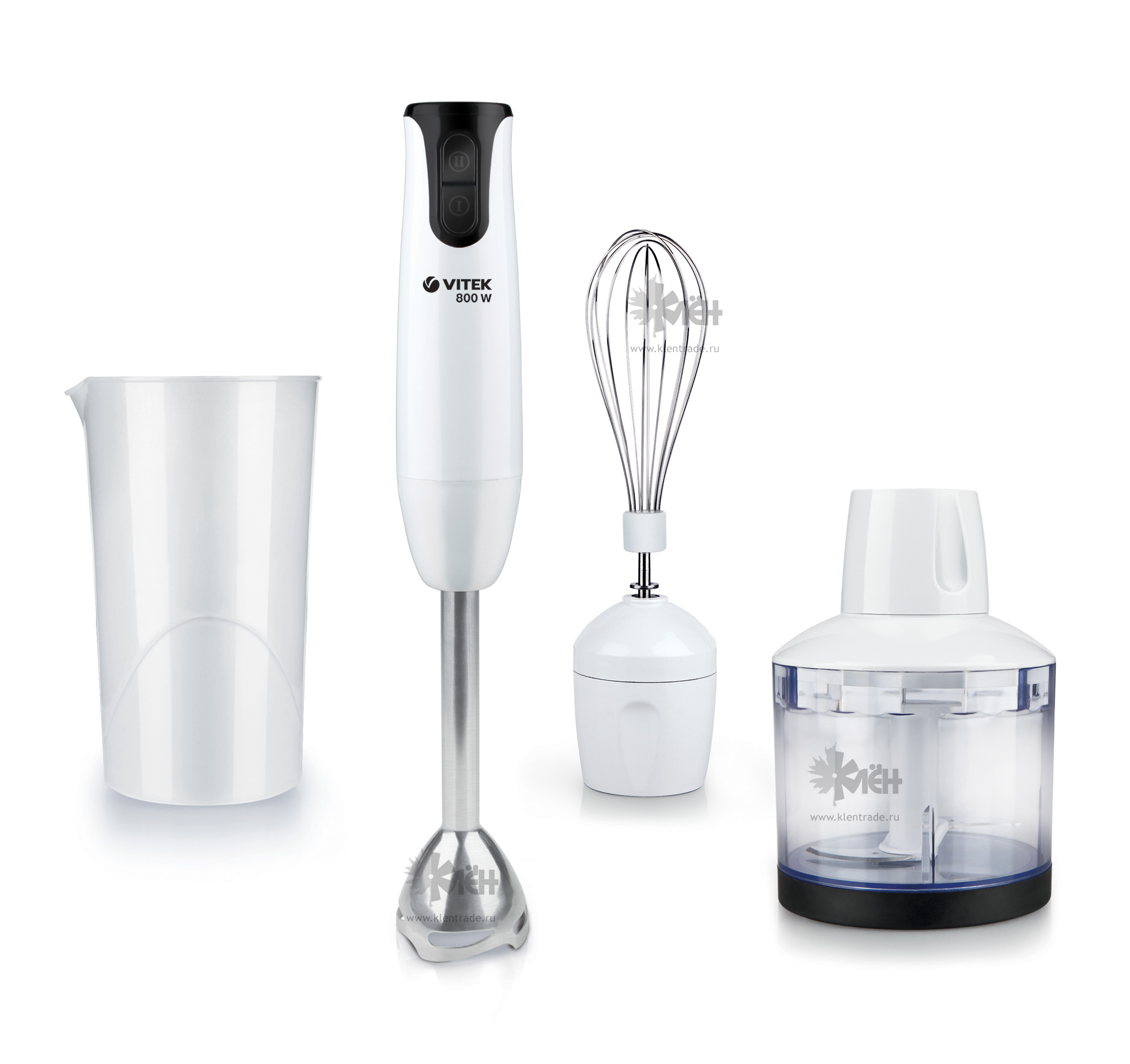 Блендерный набор VITEK VT-3412 W состоит из мощного (800 Вт) моторного блока и 3-х дополнительных насадок. Насадка чоппер объемом 0,5 л поможет вам измельчить чеснок, сыр, мясо или овощи за пару минут. Хотите сделать клубничный коктейль? Возьмите погружной блендер и удобный стакан для смешивания продуктов (0,7 л). Для начинающих кондитеров в комплекте с прибором идет венчик. Им удобно взбивать сливки, или делать крем для тортов.