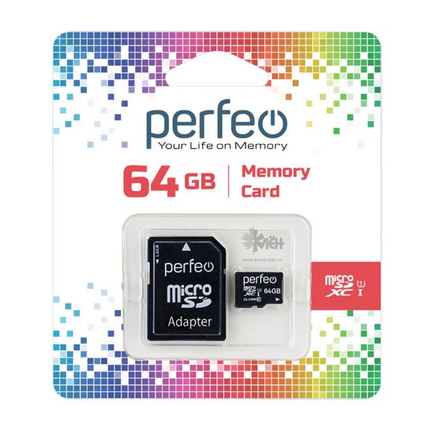 Карта памяти micro SD 64Gb Perfeo Class 10 с адаптером