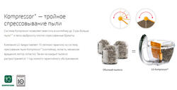 Современный пылесос использует при работе новейшую технологию. Специальная моторизированная лопасть в его контейнере сбивает пыль в компактные брикеты, что делает его более вместительным (по сравнению с моделями LG с таким же объёмом пылесборника, но без этой системы). Это гораздо облегчает очистку контейнера, минимизируя эмиссию пыли обратно в воздух.