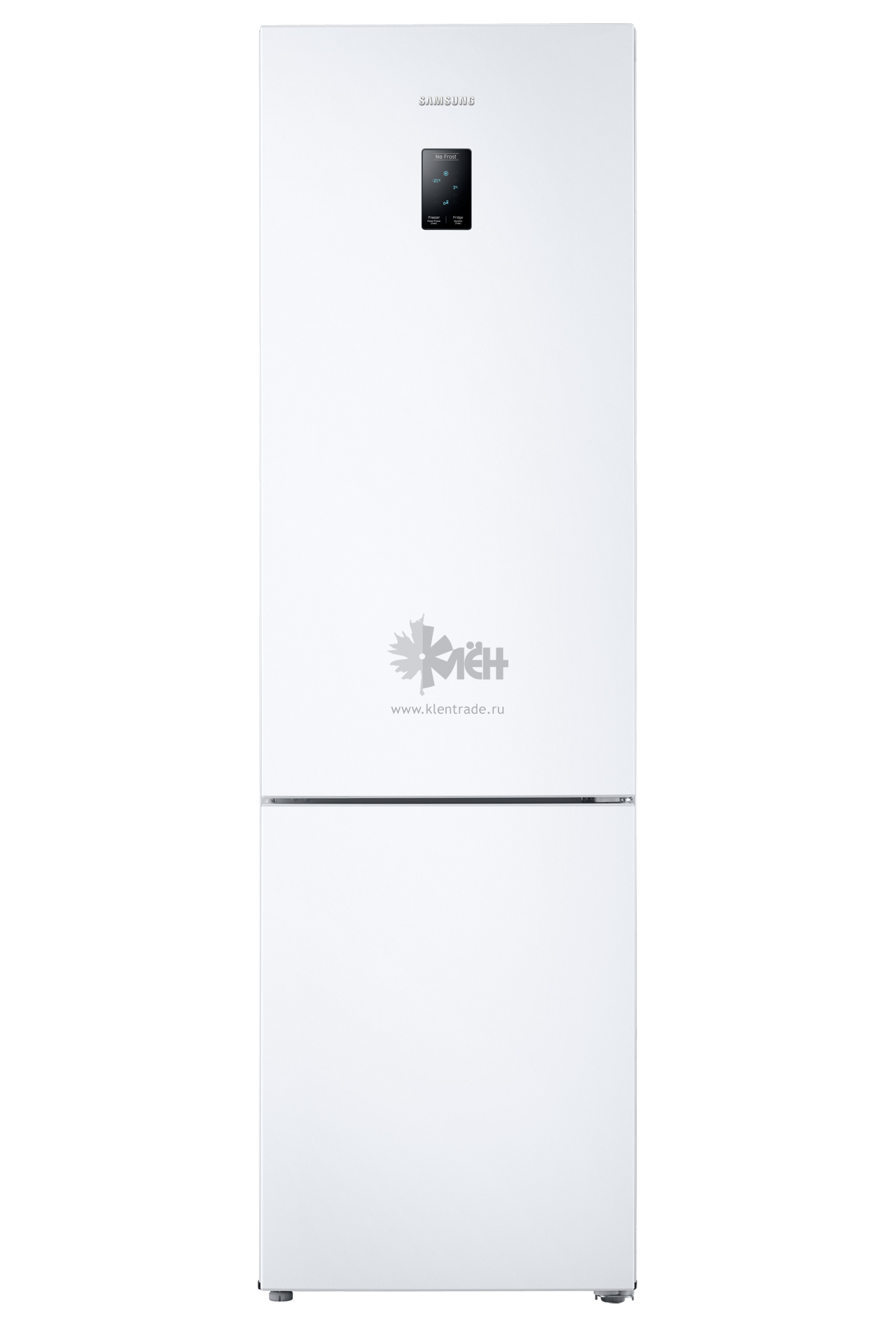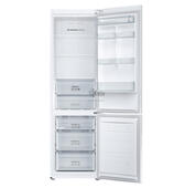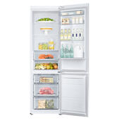 Вместительный белоснежный двухкамерный холодильник Samsung RB-37J5200WW с инверторным двигателем и морозильником, расположенным в нижней части.