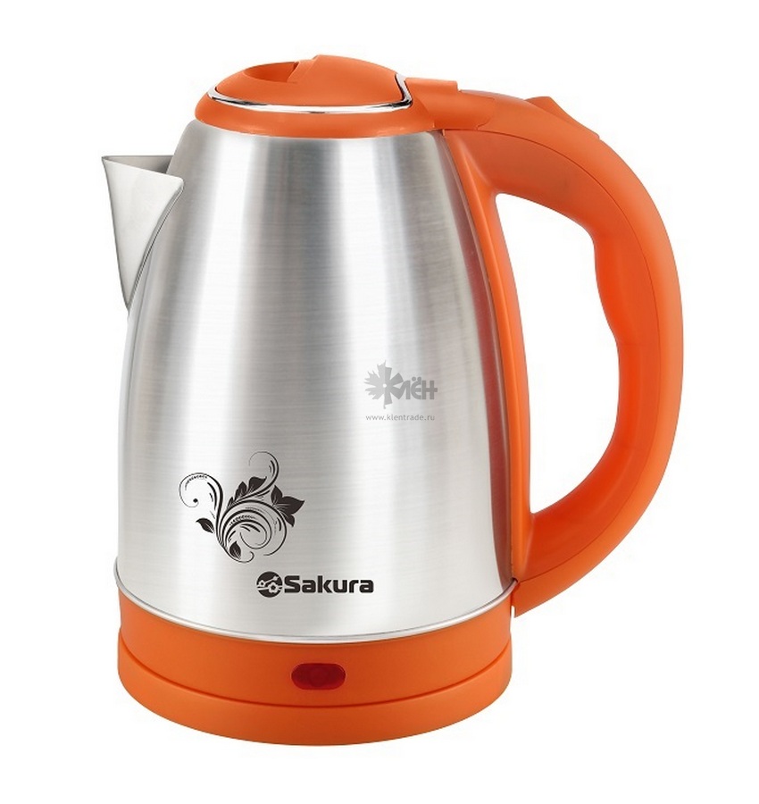 SAKURA SA-2134AS выполнен в ярком оранжевом цвете, а характерный металлический блеск придает прибору дополнительный блеск. Чайник внесет яркий акцент в любою кухню или офис. Также имеется цветочный орнамент.