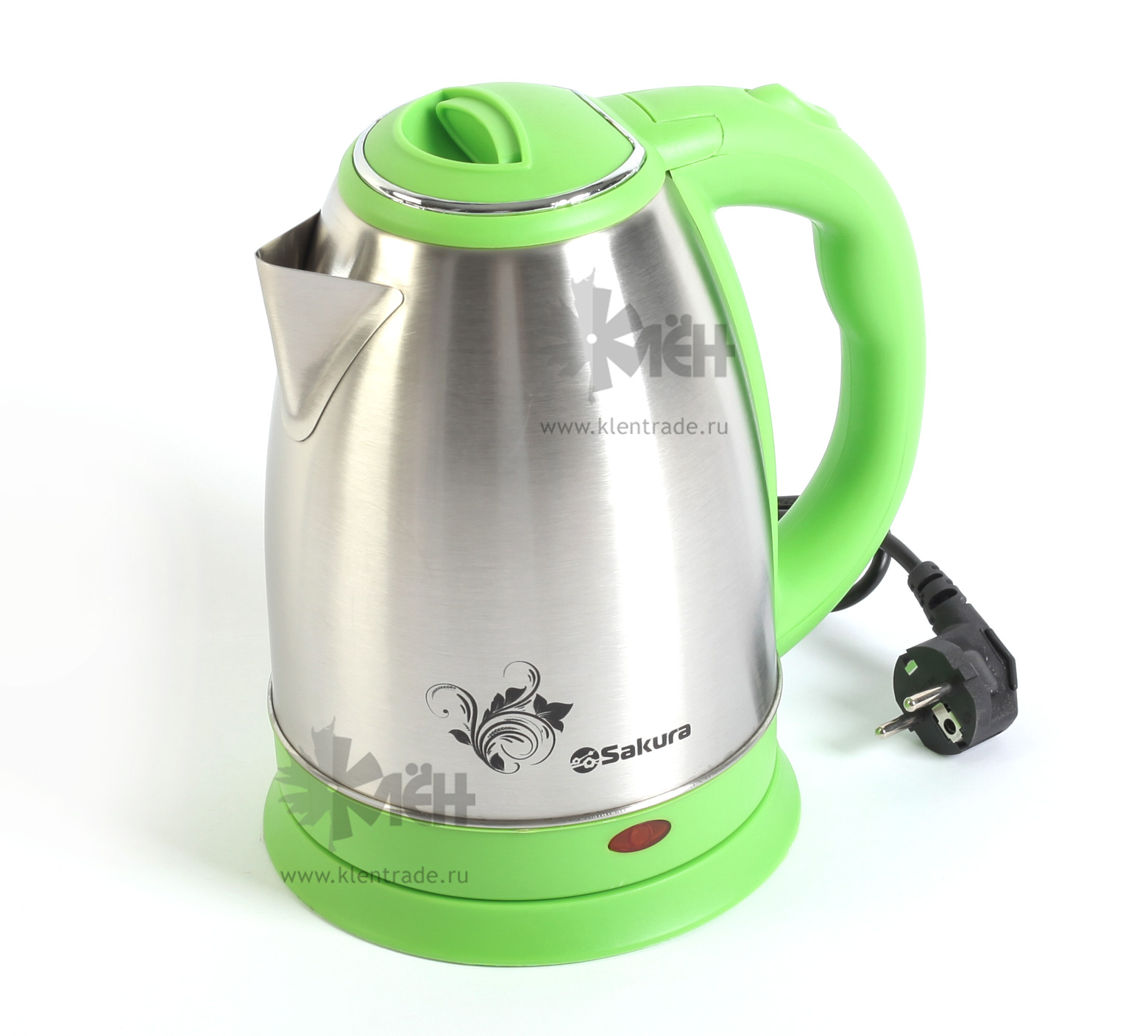 SAKURA SA-2134GS выполнен в ярком зелёном цвете, а характерный металлический блеск придает прибору дополнительный блеск. Чайник внесет яркий акцент в любою кухню или офис. Также имеется цветочный орнамент.