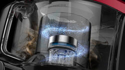 Камера пылесоса имеет практичный контейнер. Его вместительная способность для сбора пыли и мусора составляет 1,5 литра. Благодаря этому вы сможете реже его опустошать. Пылесборник имеет большую прозрачную крышку, позволяющую легко визуально и без каких-либо усилий контролировать уровень заполнения. Эргономичная по своему выполнению и не скользящая ручка Easy Grip обеспечивает простое и комфортное использование. Продуманная поворотная конструкция очень практична в использовании, она предотвращает перекручивание шланга.