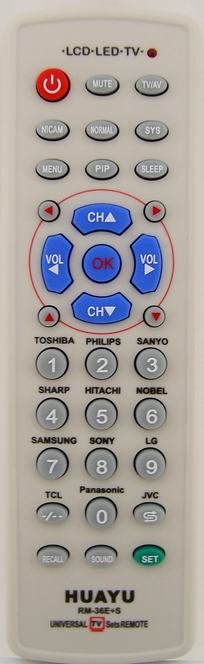 Многофункциональный пульт дистанционного управления RM-36E+ является новейшим продуктом компании HUAYU. У него большие возможности, он потребляет мало электроэнергии, полностью функционирует, имеет красивую форму и хорошее качество. В него интегрировано более 1000 моделей пультов дистанционного управления для управления ТВ. В многофункциональный пульт дистанционного управления RM-36E+ код установки можно быстро ввести ручным способом, настроить путем быстрого сканирования (удобно в тех случаях, когда марка пульта неизвестна).