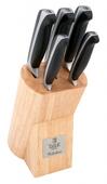 Подставка выполнена из каучукового дерева, лезвия ножей сделаны из коррозионностойкой стали 420S45. Состав набора: нож поварской 20,0 см - 1шт., нож для хлеба 20,0 см - 1 шт., нож для нарезки 20,0 см - 1 шт., нож универсальный 12,5 см - 1 шт, нож для чистки 9,0 см - 1 шт, подставка - 1 шт Рекомендуется ручная мойка