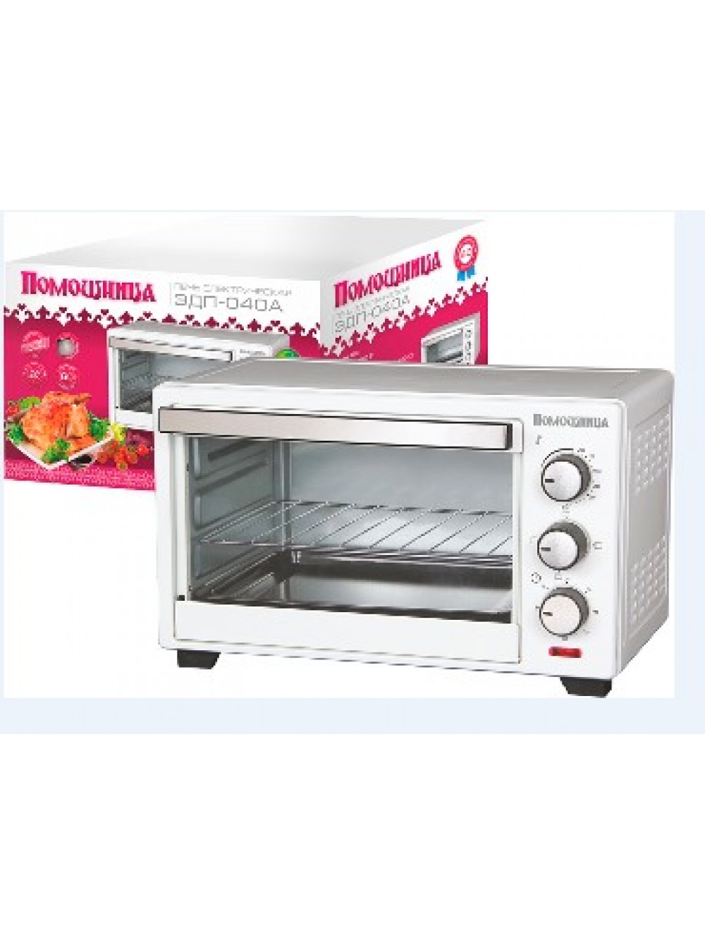 Печь электрическая Помощница ЭД-040A (Объем 40л, Мощность 1600Вт, Таймер на 60 минут, 4 нагревательных элемента из нержавеющей стали, отдельная панель управления, квадратный противни, решетка. Размеры 426х573х386 мм