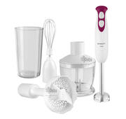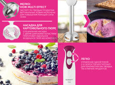 Все погружные части и ножи блендера выполнены из долговечной нержавеющей стали марки STEEL PRO, которая отлично подходит для приготовления блюд любой температуры. В комплектацию модели входят мини-измельчитель объемом 0.6 л, мерный стакан, объемом 0.6 л, венчик для взбивания насадка для приготовления картофельного пюре.