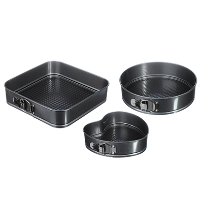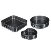 Набор из 3 разъемных форм для выпечки размерами: квадрат - 28х6,5 см, круг - d 26х6,5 см, сердце - 21,5х20,5х6,5 см, изготовлены из углеродистой стали с 2-х слойным антипригарным покрытием изнутри и снаружи и предназначены для использования в духовых шкафах.