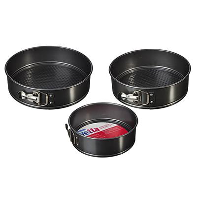 Набор из 3 разъемных форм для выпечки различного диаметра - 20см, 22см, 24см, с высотой бортика 6,5 см, изготовлены из углеродистой стали с 2-х слойным антипригарным покрытием изнутри и снаружи и предназначены для использования в духовых шкафах.