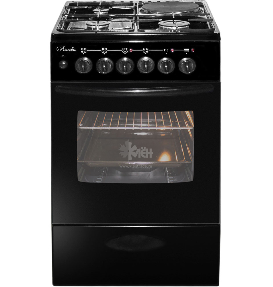 Комбинированная плита с электрической духовкой Лысьва ЭГ 1/3г01 МС-2у представлена в чёрном корпусе. Такой цвет прекрасно дополнит кухонный интерьер.