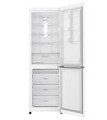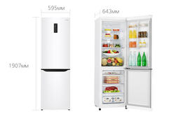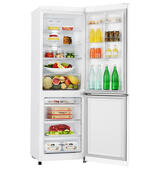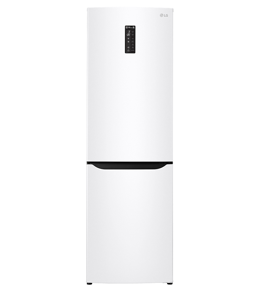 Белый вместительный двухкамерный холодильник LG GA-E429 SQRZ с морозильником, расположенным в нижней части. Холодильник имеет следующие габариты: