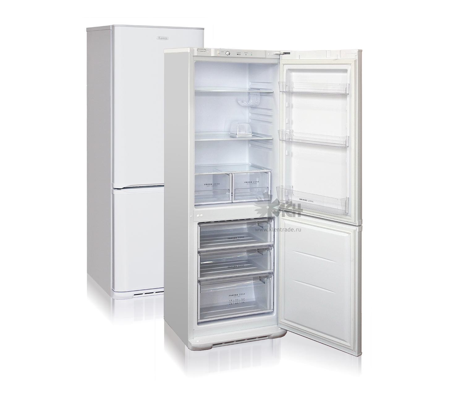 Двухкамерный холодильник Бирюса 633 выполнен в классической белой расцветке. Морозильная камера расположена в нижней части.